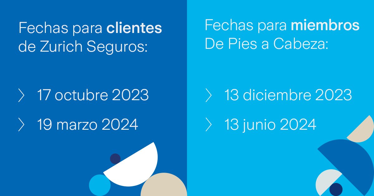 Si ya tienes claras las ventajas de ser cliente Zurich como de formar parte de la comunidad 'De Pies a Cabeza' y ya has elegido tu próximo desafío, solo te falta tomar nota de las fechas de las próximas promociones de Corre Gratis. ¡Apúntalas ya mismo en tu calendario!